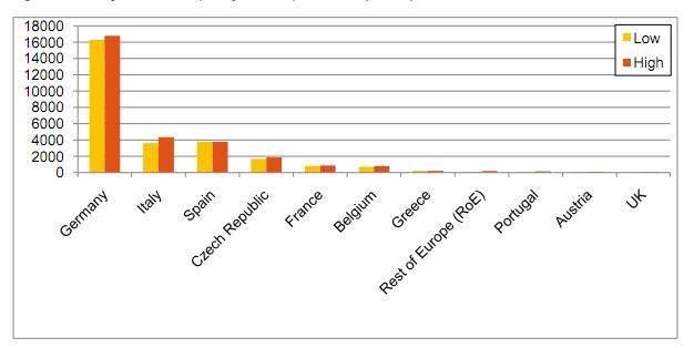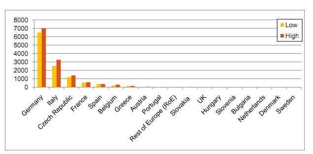 Europska tržišta: barem 3 tržišta sa preko 1 GW U 2010. je samo Europa dodala izme?u 11,6 i 13,3 GW novih FN elektrana. Procjenjuje se da ?e kona?na brojka biti oko 12,5 GW. Njema?ka je i dalje uvjerljivo prva, ali poredak iza nje se sada polako mijenja. Na drugom je mjestu Italija sa preko 1 GW, a tre?a je ?eška od koje se u budu?nosti o?ekuje veliki pad zbog smanjenja poticaja i zasi?enja tržišta. Španjolska ima 375 novih MW unato? nestabilnoj regulativi, u Francuskoj je instalirano oko 500 MW, u Gr?koj oko 150 MW, a Belgija je ponovno prešla 200 MW. Velika Britanija je kona?no po?ela instalirati solar a napredovali su i Austrija, Nizozemska, Slova?ka i Slovenija, dok u isto?noj Europi nije bilo napretka.