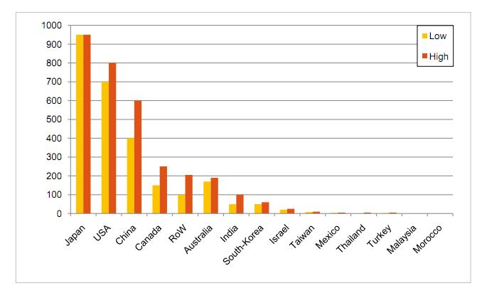 Ostatak svijeta: Zemlje izvan Europe drže trenuta?no samo 20% globalnog tržišta, te imaju ogroman potencijal u budu?nosti. 2010. je izvan Europe instalirano izme?u 2,6 i 3,2 GW.